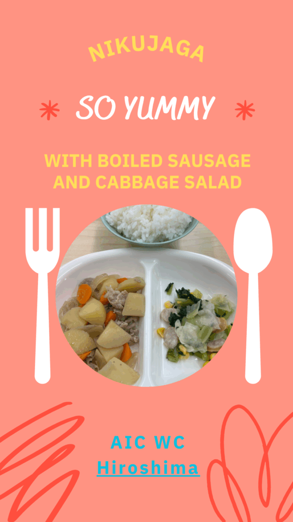 Today’s school lunch featured Nikujaga (Japanese-style stewed pork and potatoes) and a warm vegetable salad, made with freshly harvested organic vegetables from Hiroshima 🥕🥔🧅